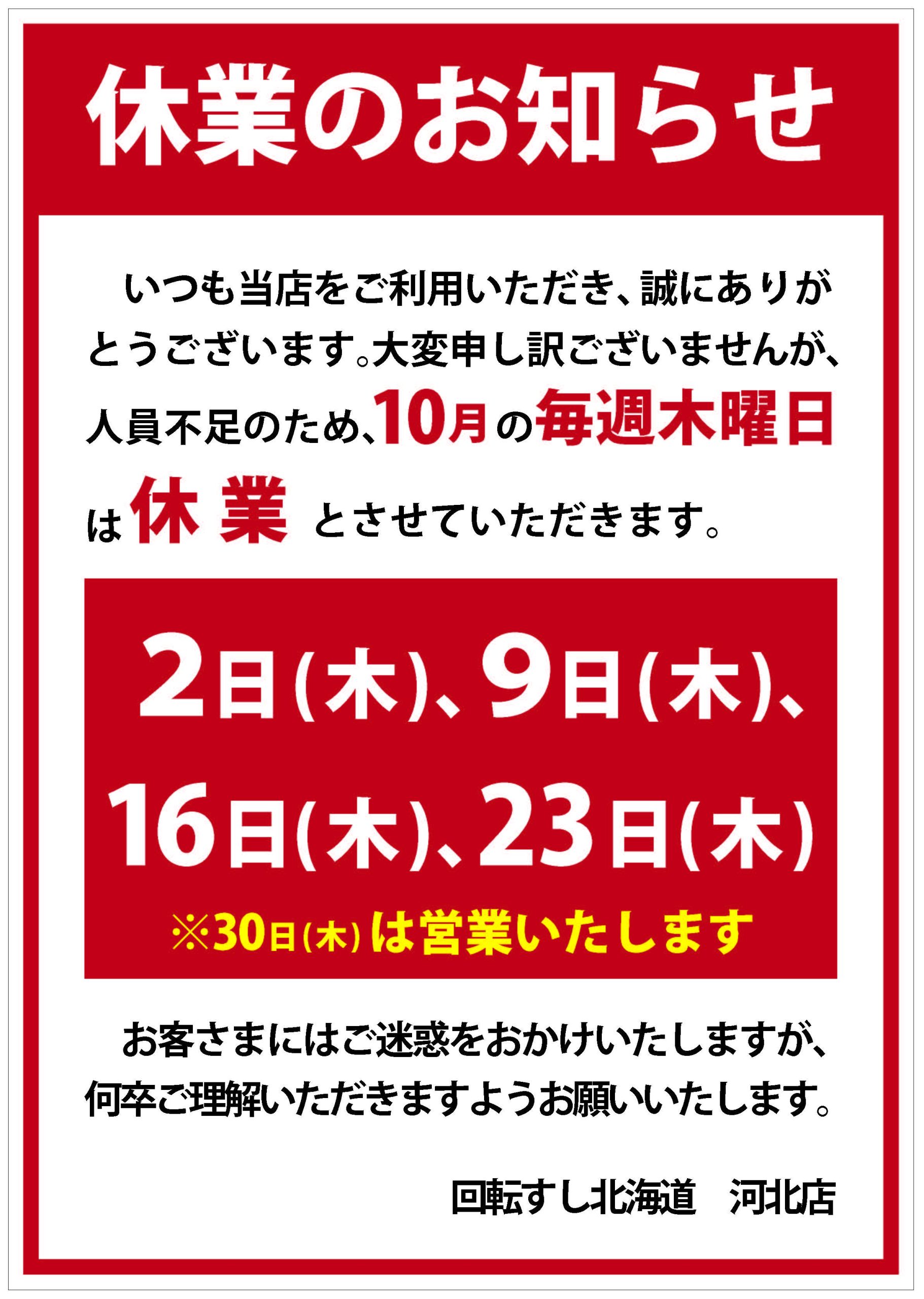 大変申し訳ございませんが、人員不足のため、10月は以下の日を休業とさせていただきます。